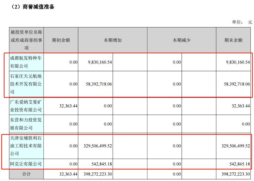 可以看到,2016年的商譽減值共有四筆,其中對天元航地和安埔勝利的減值占了大頭,分別為5839.27萬元和3.295億元。而當(dāng)初這四項并購合計花費了約8.9億元。