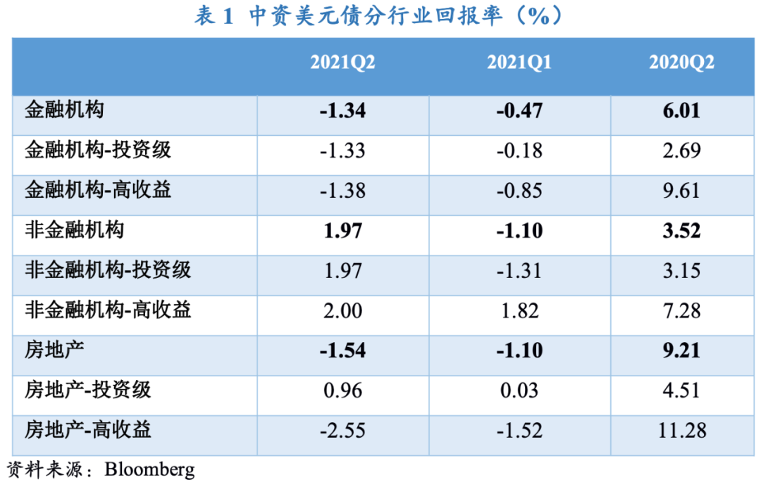 2021年二季度信用風險事件繼續發酵,拖累中資美元債收益表現。二季度,Markit iBoxx中資美元債指數總回報率繼續保持在負值區間,為-0.1%,環比收窄0.6個百分點,主要是因為5-6月投資級中資美元債再美國市場流動性寬裕環境下呈現反彈,投資者風險情緒得到小幅緩解。其中,恒大以及藍光等負面消息再次打擊市場情緒,對高收益地產板塊產生溢出效應,加之融資監管持續收緊,高收益中資美元債二季度回報率繼續下跌至-1.1%,環比和同比分別降低了0.4個和10.4個百分點;投資級中資美元債本季度回報率由負轉正,為0.3%,主要是因為非金融機構表現相對穩定,對投資級收益率起到提振作用。