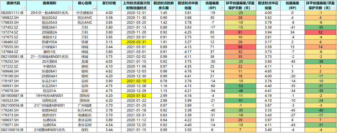 粗略認為一級市場博弈后的發(fā)行價格即為當時的真實市場價格,估值和真實市場價格之間的偏差再乘以前述基準日的剩余久期就是價格上的估值偏差。價格上的估值偏差除以票息則是抹平估值偏差(負偏離)的天數(shù)或浮盈(正偏離)對應的保護天數(shù)。