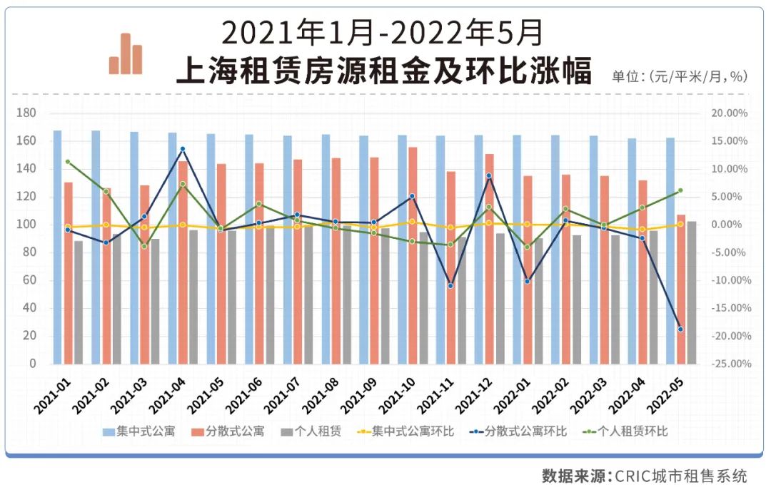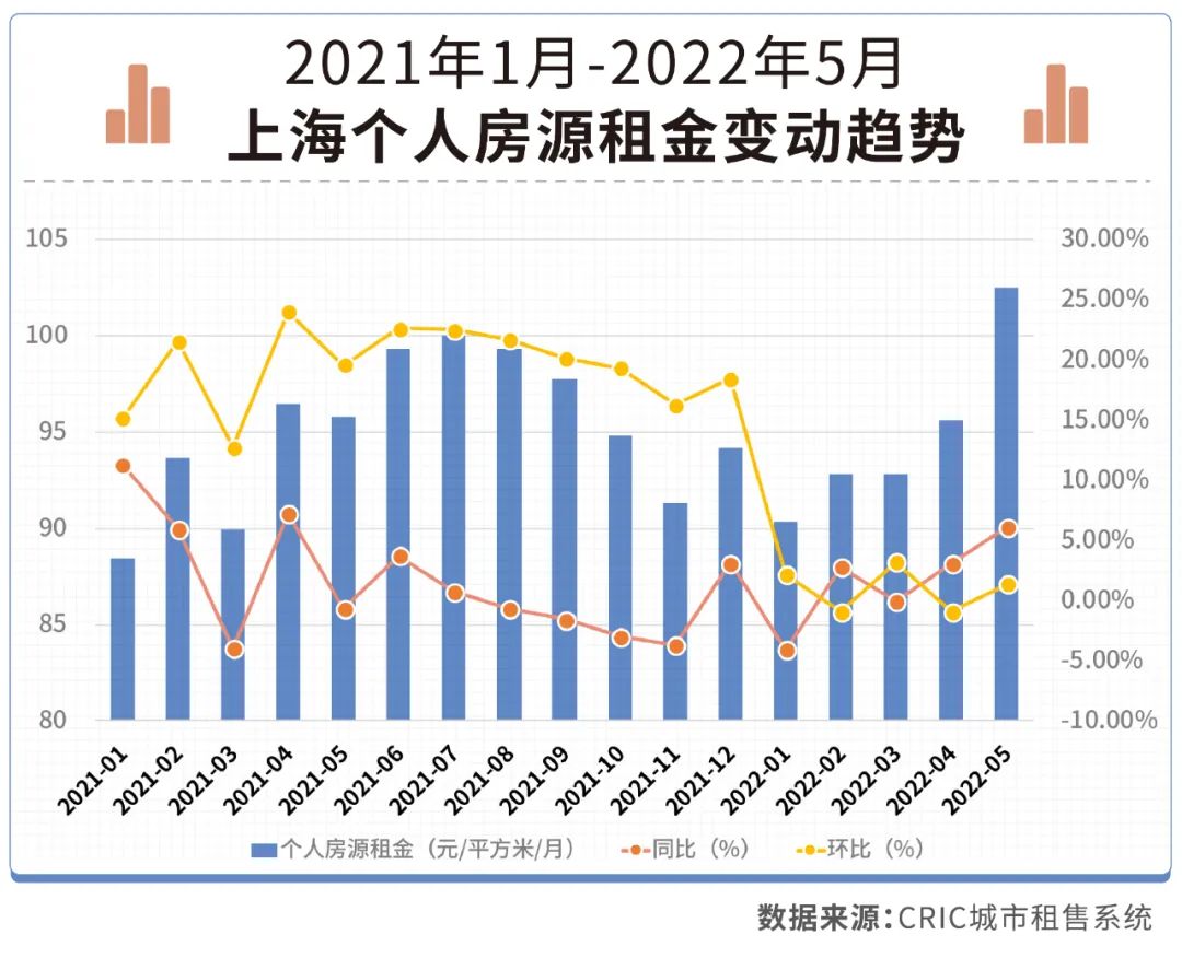 克而瑞租售監測的數據顯示,5月上海個人房源月租金每平米破百元,排在全國之首,同環比均有所上漲,其中環比漲幅排在全國前三。