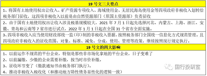 3、2018年2月28日和2018年7月20日分別發(fā)布的《關(guān)于深化黨和國(guó)家機(jī)構(gòu)改革的決定》和《國(guó)稅地稅征管體制改革方案》明確“將省級(jí)和省級(jí)以下國(guó)稅地稅機(jī)構(gòu)合并,并要求合理確定非稅收入征管職責(zé)劃轉(zhuǎn)至稅務(wù)部門的范圍,對(duì)依法保留、適宜劃轉(zhuǎn)的非稅收入項(xiàng)目成熟一批劃轉(zhuǎn)一批”。而與之相對(duì)應(yīng),2021年6月4日四部門聯(lián)合發(fā)布的19號(hào)文(參見土地出讓收入劃轉(zhuǎn)稅務(wù)部門征收,如何正確理解?)便是具體實(shí)踐。