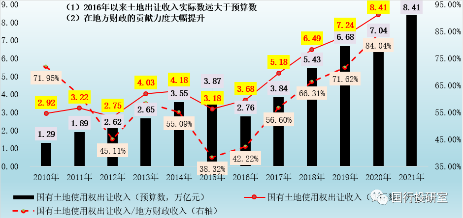 2008年“四萬(wàn)億”刺激計(jì)劃后,政策層面開始以加大貨幣財(cái)政寬松和土地投放力度來(lái)予以支撐。地方政府開始將大量土地注入各類融資平臺(tái)進(jìn)行項(xiàng)目融資。特別是2009年3月央行與銀監(jiān)會(huì)聯(lián)合發(fā)布的《關(guān)于進(jìn)一步加強(qiáng)信貸結(jié)構(gòu)調(diào)整促進(jìn)國(guó)民經(jīng)濟(jì)平穩(wěn)較快發(fā)展的指導(dǎo)意見》進(jìn)一步提高了地方政府舉債的積極性。而在2008-2016年這一時(shí)期,地方政府工業(yè)化和城市化的資金來(lái)源更多依賴于土地質(zhì)押融資,土地不僅成為推動(dòng)基礎(chǔ)設(shè)施建設(shè)的重要載體,更成為了后者的主要融資工具。同時(shí)由于土地融資導(dǎo)致實(shí)體經(jīng)濟(jì)的空心化也使得資金的提供方(即銀行等金融機(jī)構(gòu))與地方政府融資的捆綁關(guān)系更為緊密,而地方政府對(duì)土地出讓收入的依賴性也越來(lái)越強(qiáng),后者甚至成為維持地方政府債務(wù)正常運(yùn)轉(zhuǎn)的主要保障。