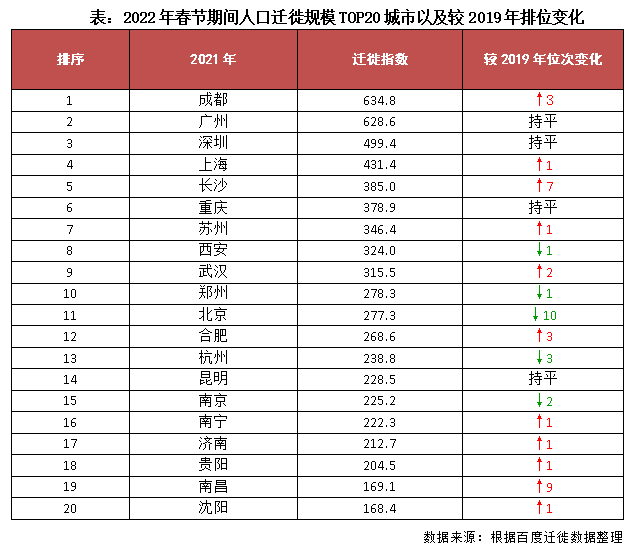 分城市來看,成都替代北京(2019、2020年榜首)和廣州(2021年榜首),成為2022年春節(jié)期間人口遷徙總量榜首城市。原因當然是多方面的,一是由于成都人口規(guī)模巨大,并且近些年人口增量也十分突出,加之西南地區(qū)疫情相對比較穩(wěn)定,返鄉(xiāng)人口規(guī)模巨大也在意料之中,另一方面成都擁有豐富的自然、人文景觀,出游人群規(guī)模也十分巨大,因此2022年春節(jié)成都人口遷徙規(guī)模躍居全國第一。長沙、南昌也與成都類似,遷徙規(guī)模排序較疫情前均明顯提升,分別提升至了7和9個位次。
