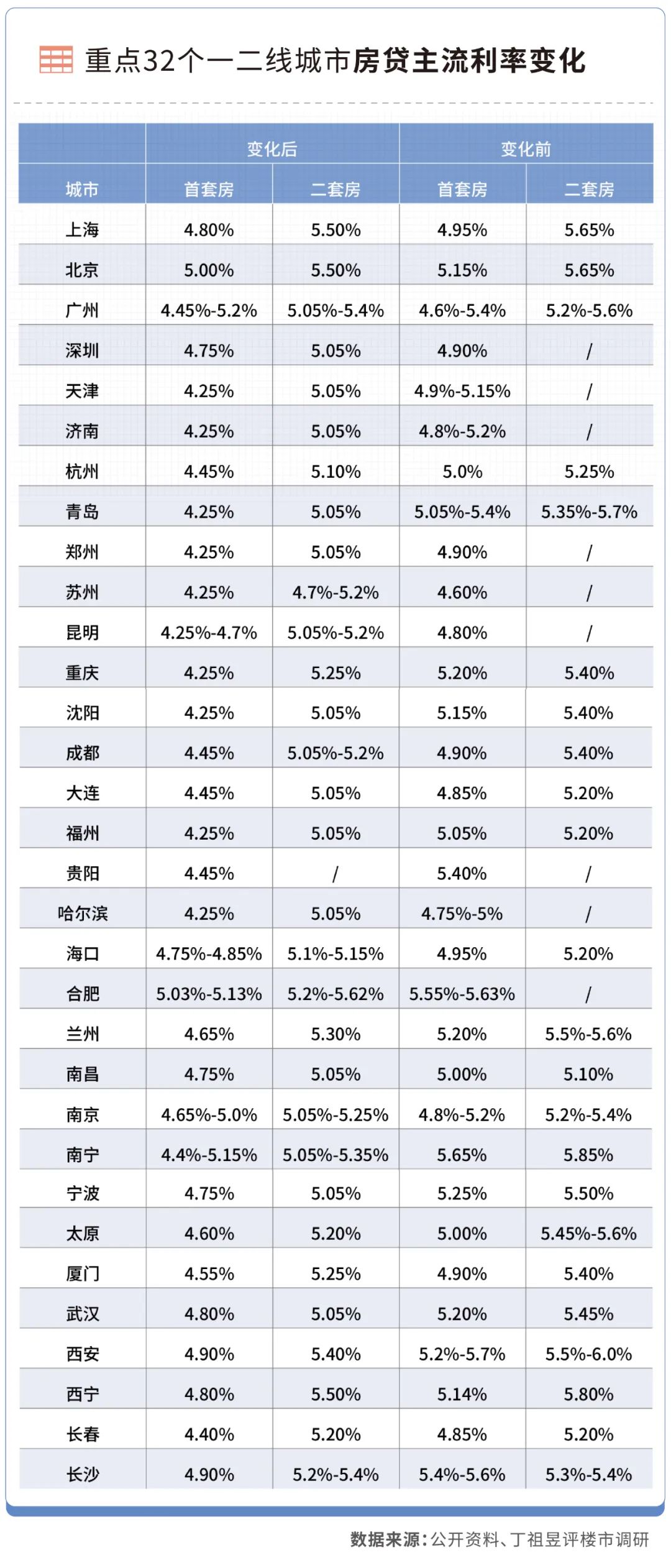 例如北京首套房利率由此前的5.15%降至5%,二套利率由此前的5.65%降至5%;上海首套房利率由此前的4.95%降至4.8%,二套利率由此前的5.65%降至5.5%。