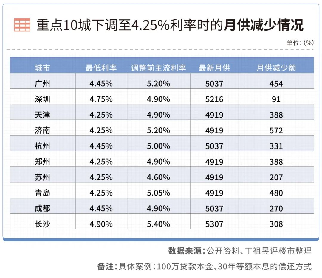 不少城市下調(diào)房貸利率至4.25%以后,我們按照“100萬(wàn)貸款本金、30年等額本息方式”的貸款方式進(jìn)行測(cè)算,以重點(diǎn)10個(gè)城市為例,月供平均減少約350元,其中廣州、天津、濟(jì)南、青島月供減少均在平均值以上。