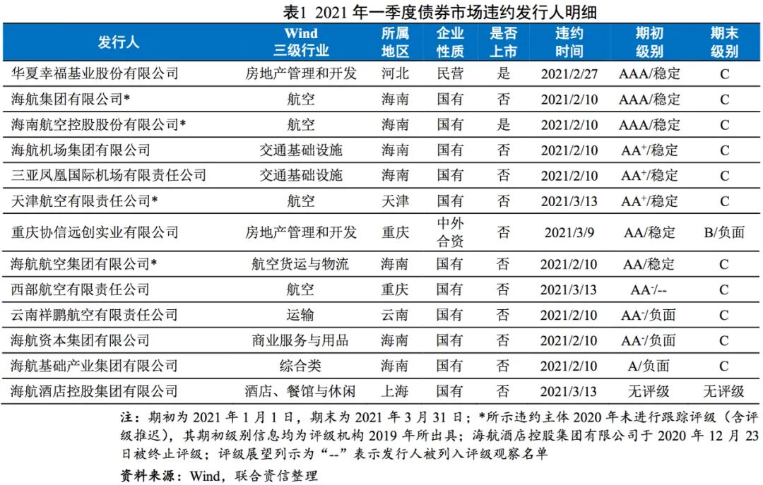 2021年一季度,海航系企業(yè)破產(chǎn)重整、弱資質(zhì)主體違約風險持續(xù)出清,債券市場平穩(wěn)運行、信用風險整體可控。