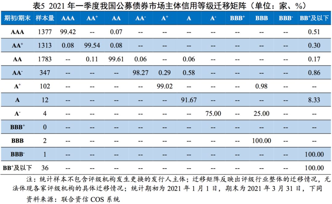2021年一季度,我國公募債券市場多數(shù)發(fā)行人和債券尚未進入評級跟蹤期,發(fā)行主體信用等級遷移數(shù)量相對較少,評級穩(wěn)定性整體較高。從信用等級遷移方向來看,樣本數(shù)量較多的A+級及以上級別均呈現(xiàn)向下遷移趨勢。