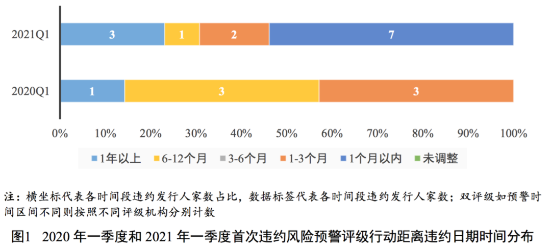 2021年一季度,我國債券市場13家新增違約發(fā)行人中有12家在違約前具有有效信用等級,違約事件發(fā)生前評級機構均通過各類評級行動進行了風險預警[7],首次違約風險預警評級行動日期距離違約日期時間在1個月以內(nèi)的有7家,1~3個月(含)的有2家,6~12個月(含)的有1家,1年以上的有3家。整體來看,2021年一季度信用評級的預警及時性較2020年一季度有所下降,主要系海航集團流動性危機較早爆發(fā)且風險處置工作復雜,部分海航系發(fā)行人因技術性因素(無法提供跟蹤評級所需資料等)導致評級預警動作滯后。