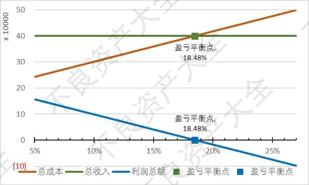 如上圖表,以未償本金余額100萬(wàn)的銀行個(gè)貸不良資產(chǎn)為例,在假設(shè)條件下,理想狀態(tài)達(dá)到盈虧分界點(diǎn)的個(gè)貸不良資產(chǎn)價(jià)格約為18.48%.也即,當(dāng)銀行個(gè)貸不良資產(chǎn)成交本金折扣率小于18.48%時(shí),該不良資產(chǎn)按假設(shè)條件處置可以盈利,反之反是。