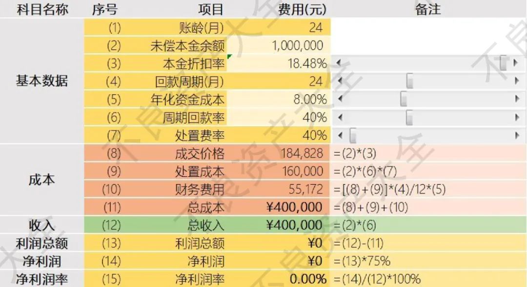 賬齡在24個(gè)月以上的銀行個(gè)貸不良,目前市場(chǎng)上平均全周期回款率要低于40%,此處按照2年回款率40%計(jì)算。