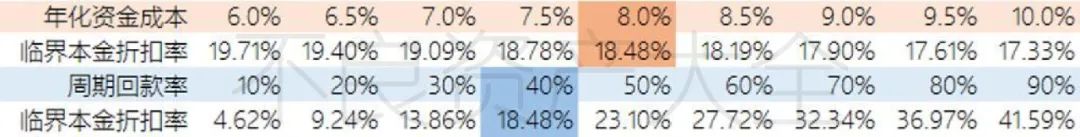 表4-2顯示了在其他假設(shè)條件均不變的情況下,單一因素年化資金成本或周期回款率分別對(duì)銀行個(gè)貸不良資產(chǎn)盈虧平衡價(jià)格(臨界本金折扣率)的影響。值得注意的是,以目前已經(jīng)成交的銀行個(gè)貸不良資產(chǎn)質(zhì)量來(lái)看,24個(gè)月的周期回款率估計(jì)在10%-40%之間。