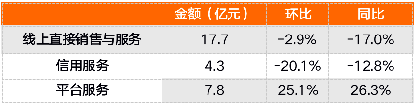 輕資本轉(zhuǎn)型繼續(xù):電商業(yè)務(wù)及信用服務(wù)收入規(guī)模下降,平臺(tái)收入規(guī)模上升,占比升至26.1%