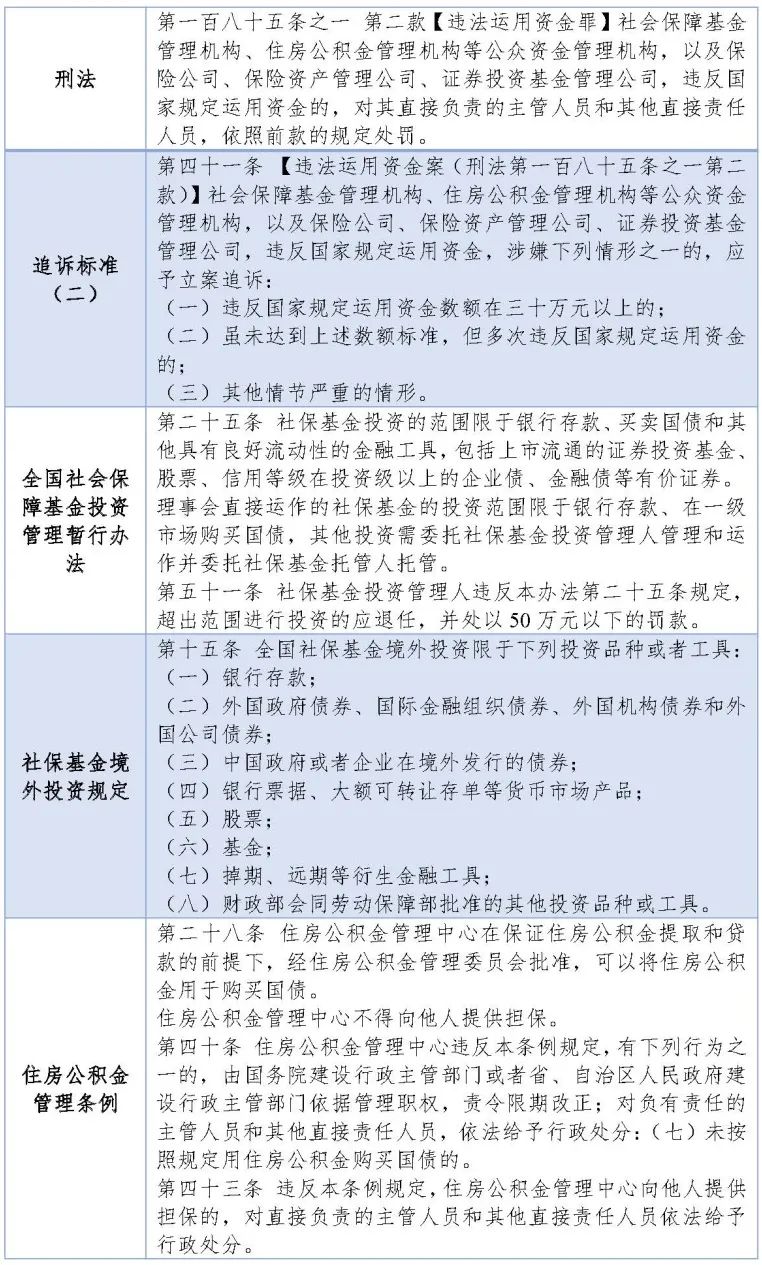 有些部門提出,負責經營、管理保險資金、社會保障基金、住房公積金等公眾資金的單位,違反國家規定運用資金的,將會嚴重影響公眾資金的安全,影響社會穩定,對情節嚴重的,應當追究刑事責任。法制工作委員會經同有關部門研究,擬在刑法中增加規定:……對保險公司、保險資產管理公司、證券投資基金管理公司、社會保障基金管理機構、住房公積金管理機構等公眾資金經營、管理機構,違反國家規定運用資金,情節嚴重的,追究刑事責任。