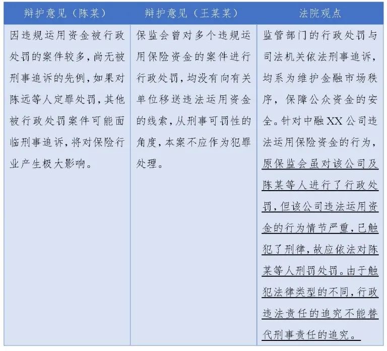 此外,在“胡某某等案”中,辯護人提出了行政違法性能夠成為阻卻刑事犯罪的理由,即如果被告單位已經受到到銀保監會的行政處罰就不應再受到刑事處罰的觀點,而法院認為不存在經過行政處罰就不能受刑事處罰的相關規定,兩者法律類型不同,行政違法責任的處罰不能替代刑事責任。