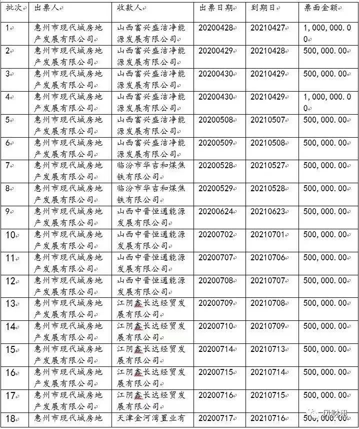 持票人透露,截至2021年5月6日,惠州市現代城房地產發展有限公司簽發的商業承兌匯票均已拒付。持票人已聯系出票人開戶行中國建設銀行股份有限公司惠州寮湖支行進行拒付確認稱,非銀行系統原因。