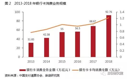 伴隨著發(fā)卡量的激增,持卡消費(fèi)也獲得了快速增長。2013-2018年,銀行卡消費(fèi)業(yè)務(wù)金額實(shí)現(xiàn)了三倍增長。同時(shí)銀行卡卡均消費(fèi)金額數(shù)據(jù)顯示,六年間卡均消費(fèi)從0.76萬元上升至1.22萬元,體現(xiàn)出我國銀行卡發(fā)卡數(shù)量擴(kuò)張帶動(dòng)的消費(fèi)規(guī)模劇增: