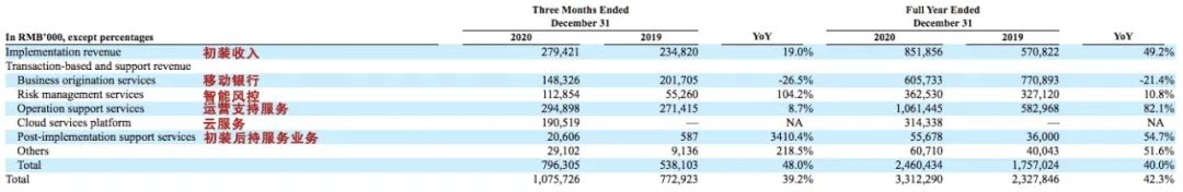 交易運營收入則是除完成平臺建設(shè)外,還繼續(xù)為客戶提供技術(shù)支持和運營服務(wù),具體包括——移動銀行、智能風(fēng)控、運營支持服務(wù)、初裝后持服務(wù)業(yè)務(wù),以及云服務(wù)。