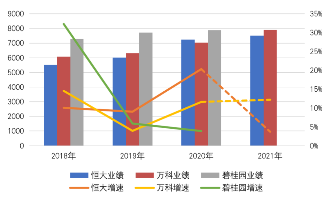 萬科將2021年銷售目標定在7900億元,意味著2021年增長率要達到12%。目前,行業(yè)前三銷售規(guī)模均超過了7000億元,分別是碧桂園、恒大、萬科,其中,碧桂園于2018年突破7000億,隨后2年都保持了個位數(shù)的低速增長,恒大在大跨步邁入7000億之后,將2021年的銷售目標定在7500億,增速降至3.7%,僅萬科在行業(yè)“零增長”甚至是“負增長”預(yù)期下,選擇“高位起跳”。