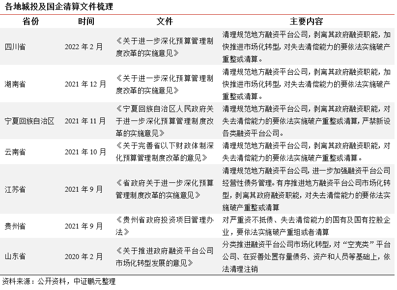 2018年9月,中共中央辦公廳、國務(wù)院辦公廳印發(fā)的《關(guān)于加強(qiáng)國有企業(yè)資產(chǎn)負(fù)債約束的指導(dǎo)意見》提出,對(duì)嚴(yán)重資不抵債失去清償能力的地方政府融資平臺(tái)公司,依法實(shí)施破產(chǎn)重整或清算,堅(jiān)決防止“大而不能倒”,堅(jiān)決防止風(fēng)險(xiǎn)累積形成系統(tǒng)性風(fēng)險(xiǎn)。2021年4月,國務(wù)院公布《關(guān)于進(jìn)一步深化預(yù)算管理制度改革的意見》【國發(fā)〔2021〕5號(hào)】提出,清理規(guī)范地方融資平臺(tái)公司,剝離其政府融資職能,對(duì)失去清償能力的要依法實(shí)施破產(chǎn)重整或清算,多省份沿用此表述。