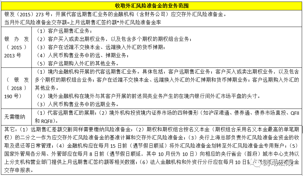 第三,2018年8月3日,央行發(fā)布《關(guān)于調(diào)整外匯風(fēng)險(xiǎn)準(zhǔn)備金政策的通知》(銀發(fā)〔2018〕190號(hào)),將繳存業(yè)務(wù)范疇分為三大類。