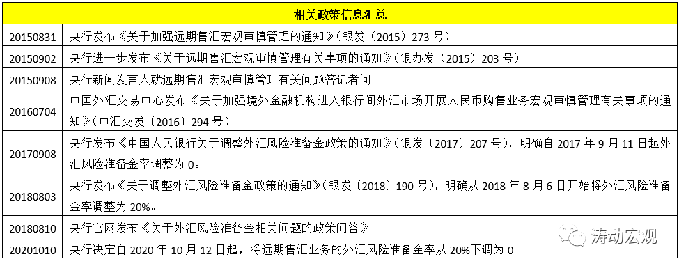 (3)2015年推出外匯風(fēng)險(xiǎn)準(zhǔn)備金制度以來,便經(jīng)過多次調(diào)整,如2017年9月8日央行宣布從2017年9月11日開始將外匯風(fēng)險(xiǎn)準(zhǔn)備金率調(diào)整為0、2018年8月3日央行宣布從2018年8月6日開始將外匯風(fēng)險(xiǎn)準(zhǔn)備金率調(diào)整為20%(同年8月24日重啟逆周期因子以及2020年10月10日央行宣布從2020年10月12日開始將遠(yuǎn)期售匯業(yè)務(wù)的外匯風(fēng)險(xiǎn)準(zhǔn)備金從20%調(diào)降至0。