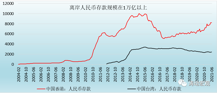 (3)離岸人民幣規(guī)模依然不高,中國(guó)香港與中國(guó)臺(tái)灣的人民幣存款分別僅為8211.92億元和2412.37億元,即便加上其它離岸人民幣市場(chǎng)(新加坡為161億元),離岸人民幣規(guī)模也僅為1.10萬億元左右,僅為國(guó)內(nèi)全部存款規(guī)模的0.50%。