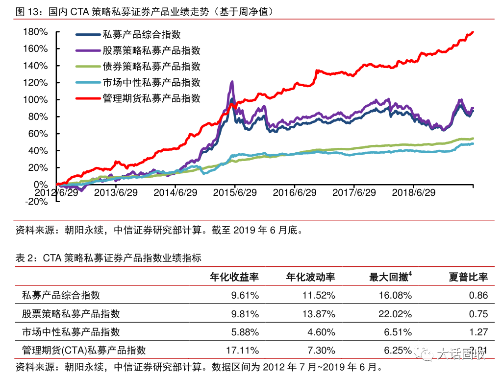 下面是到2019年年中,國內各種策略的私募產品業績走勢。排名第一的CTA管理期貨(紅線)策略一騎絕塵,幾乎不受股票市場影響。