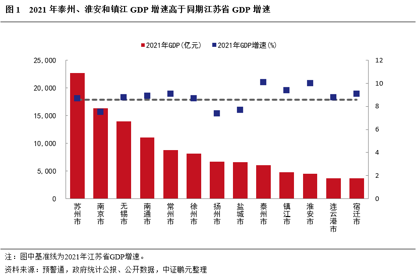 2021年蘇州、南京和無錫GDP規(guī)模繼續(xù)處于領跑地位,但泰州、淮安和鎮(zhèn)江GDP增速高于同期江蘇省GDP增速。2021年江蘇省13個地級市GDP規(guī)模均有所提升,但排位順序未發(fā)生變化。從GDP規(guī)模看,2021年GDP規(guī)模突破萬億的地級市依舊是蘇州、南京、無錫和南通,數(shù)量較2020年無變化。2021年,蘇州、無錫和南京GDP總和占江蘇省GDP的45.61%,較2020年下降0.49個百分點。蘇北地區(qū)中宿遷、連云港和淮安GDP規(guī)模依舊偏弱,依舊處于省內最后三位。從GDP增速來看,2021年由于疫情得到有效控制,各地級市GDP增速均高于2020年。2021年,南京、揚州和鹽城GDP增速低于同期江蘇省GDP增速,泰州、淮安和鎮(zhèn)江雖然廣義債務負擔較重,但2021年GDP增速明顯高于同期江蘇省GDP增速,其余地級市GDP增速基本和江蘇省GDP增速持平。