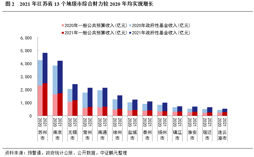 2021年江蘇省13個地級市綜合財力【1】均高于2020年,2021年宿遷財政自給率水平較2020年大幅提高,鎮(zhèn)江和蘇州財政自給率則有所下滑。從綜合財力規(guī)模來看,2021年,除鎮(zhèn)江、淮安、連云港和宿遷綜合財力在千億規(guī)模以下,其他地級市綜合財力均在千億以上,其中泰州市首次突破千億大關。變動趨勢上,2021年各地級市一般公共預算收入和政府性基金收入規(guī)模均高于2020年。從綜合財力構成上看, 2021年江蘇省13個地級市里只有蘇州市、南京市和無錫市一般公共預算收入均在千億以上,分別為2,510億元、1,730億元和1,201億元。2021年,蘇州、南京、無錫、南通、常州和徐州政府性基金收入均在千億元以上,分別為2,316億元、2,493億元、1,226億元、1,442億元、1,468億元和1,035億元。