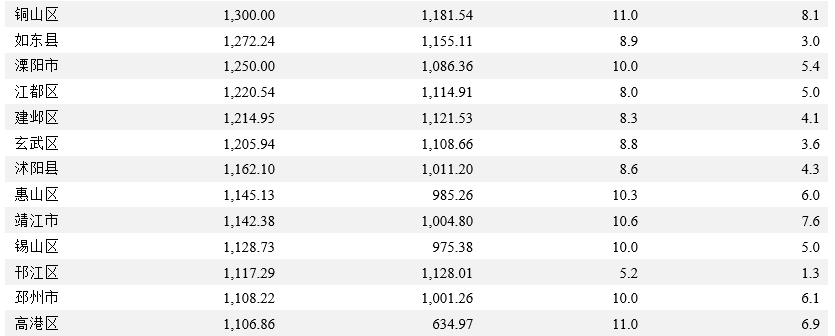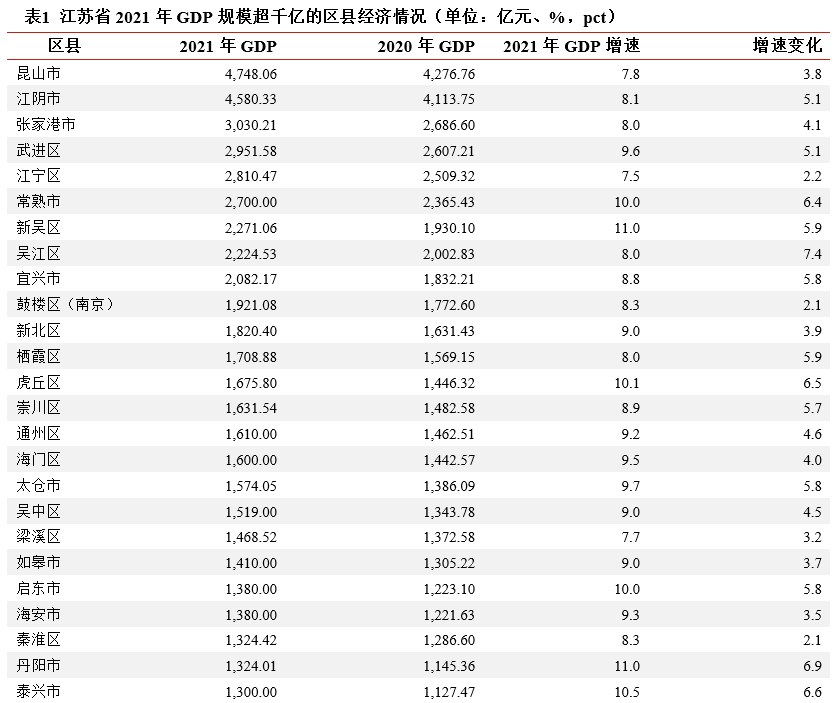 2021年除邗江區(qū)外,江蘇省其他各區(qū)縣GDP規(guī)模均有所提升,響水縣GDP增速下滑0.1個百分點。2021年江蘇省各區(qū)縣GDP規(guī)模大多處于增長狀態(tài),其中昆山、江陰和張家港市GDP規(guī)模仍處于頭部位置,且2021年張家港GDP突破三千億大關,新吳區(qū)和宜興市則突破兩千億大關。但邗江區(qū)2021年GDP下滑10.72億元至1,117.29億元。GDP增速方面,除盱眙縣、沛縣、贛榆區(qū)和豐縣未獲得GDP增速外,2021年江蘇省大部分區(qū)縣GDP增速均高于2020年,但響水縣GDP增速下滑0.1個百分點至6.0%。