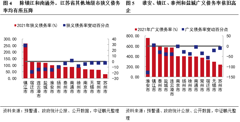 除南通和鎮(zhèn)江外,2021年江蘇省各地級市狹義債務率【2】均有所壓降;2021年淮安、鎮(zhèn)江、泰州和鹽城廣義債務率依舊較大。2021年鎮(zhèn)江債務壓力依舊較大,當年末鎮(zhèn)江狹義債務率增加27.91個百分點至265.59%,位于各地級市首位,廣義債務率亦高企,鎮(zhèn)江化債壓力依舊較大。從狹義債務率壓降看,宿遷壓降力度最大,2021年宿遷狹義債務率較2020年末下降18.44個百分點;其次,2021年淮安、鹽城和連云港狹義債務壓降力度均在10個百分點以上。廣義債務率方面,2021年淮安、鎮(zhèn)江、泰州和鹽城廣義債務率排名較2020年無變化,依舊位于江蘇省各地級市前列。