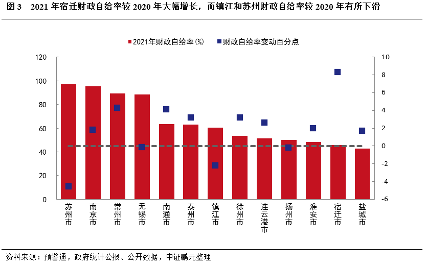 財政自給率方面,2021年蘇州和鎮(zhèn)江財政自給率較2020年分別下滑4.59個百分點、2.20個百分點至97.15%和60.29%,無錫和揚州財政自給率基本和2020年持平,宿遷財政自給率提升較為明顯,2021年宿遷財政自給率上升8.28個百分點至45.80%,主要系2021年宿遷綜合財力較2020年增加明顯,且一般公共預算支出變動不大所致。
