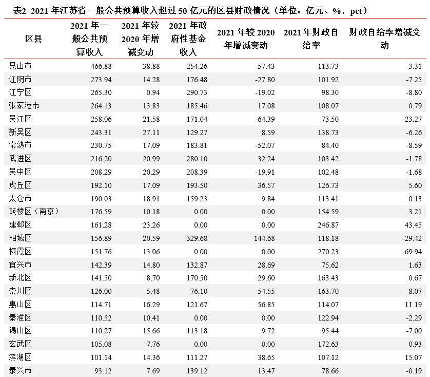 2021年江蘇省絕大部分區(qū)縣一般公共預算收入較2020年均有增長,但18個區(qū)縣政府性基金收入下滑,33個區(qū)縣財政自給率表現(xiàn)弱于2020年。一般公共預算收入方面,2021年昆山、江陰和江寧區(qū)一般公共預算收入仍穩(wěn)居頭部,邗江區(qū)一般公共預算收入較2020年下滑5.70億元至54.41億元。受2021年房地產(chǎn)市場疲軟影響,2021年江蘇省有18個區(qū)縣政府性基金收入較2020年有所下滑,其中吳江區(qū)下滑幅度最大,當年政府性基金收入下滑64.39億元至171.04億元。2021年崇川區(qū)、常熟市和江陰市政府性基金收入較2020年分別下滑54.55億元、52.07億元和27.80億元。財政自給率方面,2021年江蘇省95個區(qū)縣中有33個區(qū)縣財政自給率表現(xiàn)弱于去年,相城區(qū)、京口區(qū)、天寧區(qū)、吳江區(qū)和鐘樓區(qū)財政自給率較去年同期下降20個百分點以上。