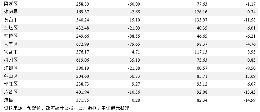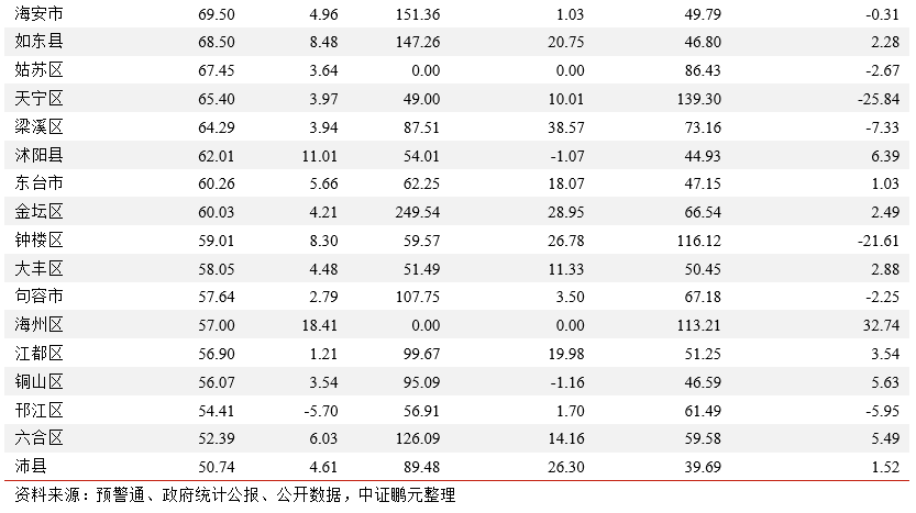 財政情況:2021年宿遷財政自給率大幅提高,95個區(qū)縣中有33個區(qū)縣財政自給率表現(xiàn)弱于去年。2021年江蘇省各地級市一般公共預算收入和政府性基金收入均較2020年有所提高,2021年宿遷財政自給率表現(xiàn)亮眼,較2020年提高8.28個百分點至45.80%,蘇州、南京、常州和無錫經(jīng)濟實力依舊較強、財政自給率依舊較高。區(qū)縣層面,2021年江蘇省絕大部分區(qū)縣一般公共預算收入和政府性基金收入均有所增長,昆山、江陰和江寧區(qū)一般公共預算收入仍穩(wěn)居頭部,但2021年邗江區(qū)一般公共預算收入下滑5.70億元至54.41億元,吳江區(qū)政府性基金收入下滑64.39億元至171.04億元,相城區(qū)、京口區(qū)、天寧區(qū)、吳江區(qū)和鐘樓區(qū)財政自給率較去年同期下降20個百分點以上。
