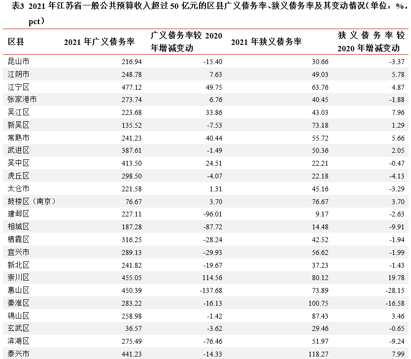 債務情況:鎮(zhèn)江市化債壓力依舊較大,洪澤區(qū)、高港區(qū)和京口區(qū)狹義債務率增加明顯,但江蘇省區(qū)縣級債務率整體仍有壓降。地級市層面,2021年除鎮(zhèn)江和南通外,其余地級市狹義債務率均有所壓降,2021年鎮(zhèn)江狹義債務率上升27.91個百分點至265.59%,淮安、鎮(zhèn)江、泰州和鹽城的廣義債務率依舊較高。區(qū)縣層面,2021年洪澤區(qū)、高港區(qū)、丹徒區(qū)和泗陽縣狹義債務率超過200%,債務負擔較重。蘇州市、無錫市和常州市因財政實力較強,下轄區(qū)縣狹義債務率整體偏低,2021年江蘇省95個區(qū)縣中有55個區(qū)縣狹義債務率較2020年有所壓縮,其中淮安區(qū)狹義債務壓縮最明顯(下降81個百分點),2021年新沂市和洪澤區(qū)廣義債務率分別超過900%和700%,大豐區(qū)、連云區(qū)、高淳區(qū)、海州區(qū)、浦口區(qū)和溧水區(qū)廣義債務率亦高于600%,但95個區(qū)縣中有61個區(qū)縣廣義債務率較2020年有所壓降。