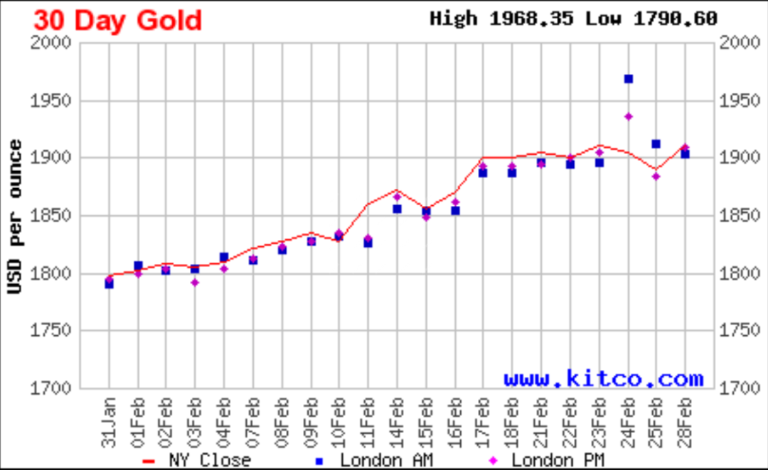 近期受到俄烏沖突影響,2周內,金價自1850美元沖高到1974美元高點。