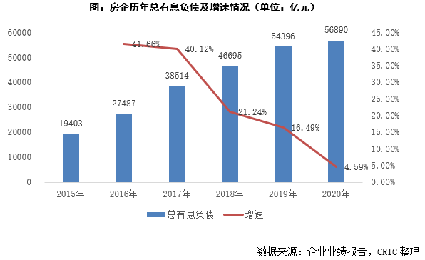 2020年末67家重點房企的總有息債規(guī)模為56890億元,同比增長了4.59%,增速較于2019年下滑超過10個百分點。可以看到,總有息債的增速自2018年實現(xiàn)斷崖式下跌后,再一次迎來較大幅度的下降,近兩年的行業(yè)調(diào)控效果逐步顯現(xiàn),特別是2020年政府出臺三條紅線相關(guān)調(diào)控政策后,一方面很多企業(yè)為了減少踩線,積極調(diào)整財務(wù)結(jié)構(gòu),有息負債不增反降,另一方面整體調(diào)控帶來的對有息債總量上漲幅度的限制,也使得房企的有息債增速下降。