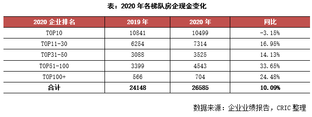 從各梯隊來看,持有現(xiàn)金量跟房企規(guī)模大體成正比,TOP10房企仍擁有著絕對的領(lǐng)先地位。從增速來看,TOP10房企的現(xiàn)金持有量同比減少了3.15%,是唯一現(xiàn)金減少的梯隊。值得注意的是,TOP50+梯隊的房企現(xiàn)金增幅相對較大,同比增長達到20%以上,在“三條紅線”的共識下,中小型房企意圖建立更強的風(fēng)險抗擊能力,加大持有現(xiàn)金量以應(yīng)對更加復(fù)雜的市場環(huán)境。