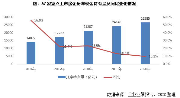 2020年末67家重點上市房企的現(xiàn)金持有量為26585億元,同比增長10.1%,增速較2019年下降3.35個百分點。現(xiàn)金持有量同比增速由2016年的56.0%的增速下降到2020年的10.1%,呈下降趨勢,且近兩年逐漸下降到一個相對穩(wěn)定的區(qū)間,主要在于隨著政策持續(xù)調(diào)控,近兩年行業(yè)已經(jīng)進入緩慢增長期,疊加近期三條紅線的調(diào)控出臺,短期內(nèi)現(xiàn)金的增長也相對平穩(wěn)。