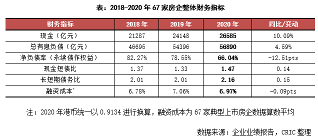 2020年末67家房企的加權(quán)凈負債率(永續(xù)債作為權(quán)益)約為66.04%,同比大幅下降了12.5個百分點,下降幅度是近三年來新高。三條紅線出臺后,由于凈負債率需低于100%的紅線要求,房企積極進行降杠桿,一方面通過出售項目,加大現(xiàn)金回款率等多種方式促進現(xiàn)金增長,現(xiàn)金同比增長了10.1%個百分點;同時,減少負債增加額,總有息債同比漲幅僅為4.6%;最后,通過加大合作,或者實現(xiàn)上市、分拆旗下業(yè)務(wù)板塊上市的方式,保持較高的權(quán)益增長速度,67家房企的總權(quán)益同比增長20.1%。在此消彼長的情況下,房企的整體凈負債率得到較大的改善。