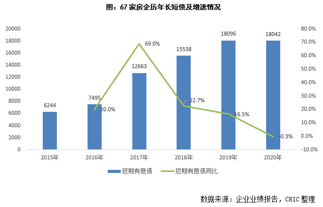 從有息債的期限結(jié)構(gòu)來看,2020年末67家房企的短期有息債18042億元,同比下降0.30%,近五年來首次出現(xiàn)同比下降的情況,而此前短債的年同比增速均保持在20%左右的水平;同時,2020年末長期有息債39008億元,同比增長7.09%。三條紅線出臺后,可以看到房企的有息債增速進一步下降,同時由于“三條紅線調(diào)控中其中的一條紅線為現(xiàn)金短債比不得小于1的硬性指標(biāo),房企積極調(diào)整負債結(jié)構(gòu),積極贖回短債,確保過線。