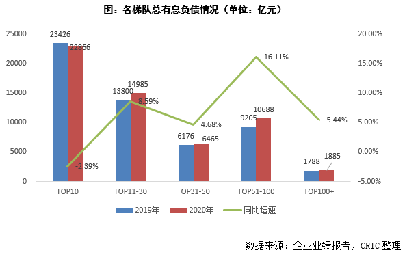 從各梯隊的表現(xiàn)來看,2020年末 TOP10房企的總有息債規(guī)模實現(xiàn)負增長,同比下降2.39%至22866億元。除了TOP10以外其余四個梯隊的房企均實現(xiàn)了總有息債的增長, TOP51-100的房企增幅最大,同比增長16.11%至10688億元,而TOP31-50及TOP100+梯隊的房企增速相對較小。可以看到,房企整體的有息債增長較為緩慢且均衡,但各個梯隊的變動有所分化,部分頭部房企主動追求降杠桿,TOP11-30和TOP51-100等規(guī)模擴張的房企則增長相對較大,TOP31-50及TOP100+的房企求穩(wěn),增長較小。