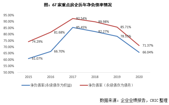 值得注意的是,永續(xù)債理論上雖然也能為企業(yè)增添權(quán)益,改善杠桿,但由于永續(xù)債“明股實債”的特性,三條紅線提出后監(jiān)管層面嚴(yán)控房企永續(xù)債發(fā)行,2020年三條紅線公布之后企業(yè)新發(fā)行的永續(xù)債量約為84億元,占全年22%,2021年至今無企業(yè)發(fā)行永續(xù)債。基于此,2020年末67家重點房企的永續(xù)債存量1429億元,同比減少56億元。永續(xù)債作為債務(wù)計算的加權(quán)凈負債率為71.37%,同比減少14.3個百分點。