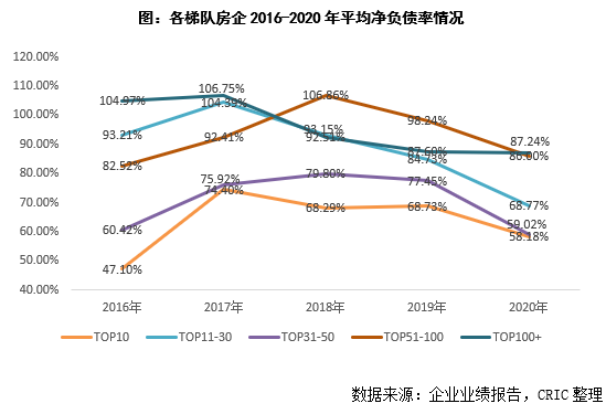 從各梯隊的企業(yè)表現(xiàn)來看,2020年末凈負債率最低的梯隊還是TOP10房企,為58.18%,實際上,50強房企凈負債率差距不大,且明顯低于排名第50名之后的房企。值得注意的是,所有梯隊的房企的加權(quán)凈負債率均實現(xiàn)了下降,其中TOP31-50的房企降幅最大,同比減少18.43個百分點至59.02%,TOP100+房企凈負債率僅下降0.36個百分點至87.24%。