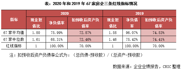 自從2020年8月底政府頒布三條紅線監(jiān)管指標(biāo)以來,三條紅線就成為房企改善財務(wù)狀況的一個重要衡量標(biāo)準(zhǔn)。從67家重點房企2020年底的財務(wù)情況來看,其現(xiàn)金短債比的算數(shù)平均值為1.8,中位數(shù)為1.61;凈負債率的算數(shù)平均值為75.99%,中位數(shù)為68.31%,現(xiàn)金短債比和凈負債率兩項指標(biāo)基本都能達標(biāo)。僅有剔除預(yù)收款后的資產(chǎn)負債率無論是算術(shù)平均還是中位數(shù)都均超70%,未來將是房企改善的重點。
