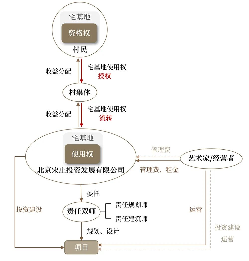 宋莊創(chuàng)新宅基地經(jīng)營權(quán)市場化流轉(zhuǎn)創(chuàng)新模式,將宅基地使用權(quán)流轉(zhuǎn)到鎮(zhèn)級公司平臺——北京宋莊投資發(fā)展有限公司(以下簡稱:宋投公司)。由宋投公司對宅基地進行統(tǒng)籌、管理、經(jīng)營,避免村民與藝術(shù)家、經(jīng)營者產(chǎn)生直接矛盾沖突,控制房屋價格。