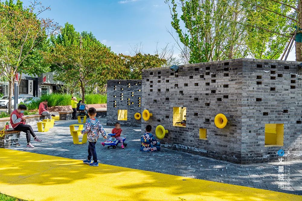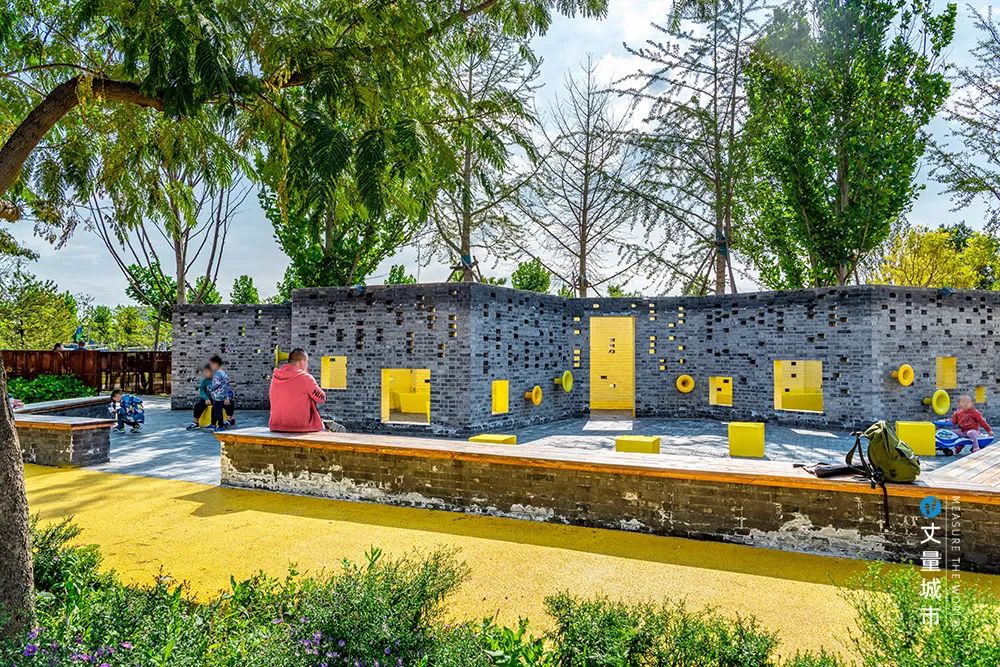 灰磚和暖黃鋪裝在色彩上碰撞融合,剛硬的底色上傳達出了溫暖和樂觀的感覺,也與公園內(nèi)的法桐樹、銀杏樹遙相呼應,深秋葉黃,必是一番好景致。穿孔灰色墻磚又與穿孔耐候鋼、不銹鋼雕塑交替組合,則在構(gòu)件上實現(xiàn)了傳統(tǒng)與現(xiàn)代交融的層次感。