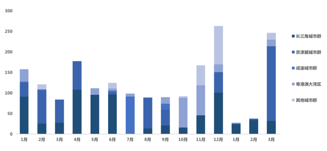 從城市群來看,前2個月長三角城市群成交總額遠超其他城市群,而3月,京津冀城市群成交總額快速拉升。
