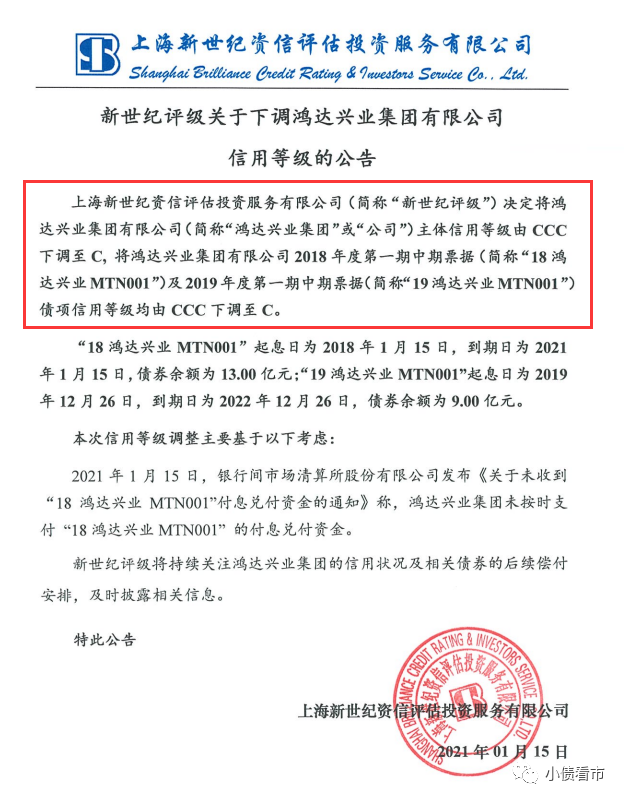 近日,新世紀評級將鴻達興業集團有限公司(以下簡稱“鴻達興業集團”)主體和“18鴻達興業MTN001”、“19 鴻達興業MTN001”債項信用等級由CCC下調至C。