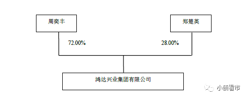 從股權結構上看,鴻達興業集團的控股股東為自然人周奕豐,持股比例為72%,二股東鄭楚英持股28%,兩人為夫妻關系。